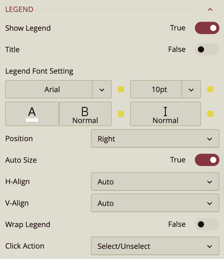 The legend is set to Auto Size by default. To manually define the legend size, disable this setting by setting Auto Size to False. You can also control the Horizontal and Vertical Alignment, which are both set to Auto by default, but can be changed using dropdown options. To allow legend labels to wrap across lines, set the Wrap Legend option to True.