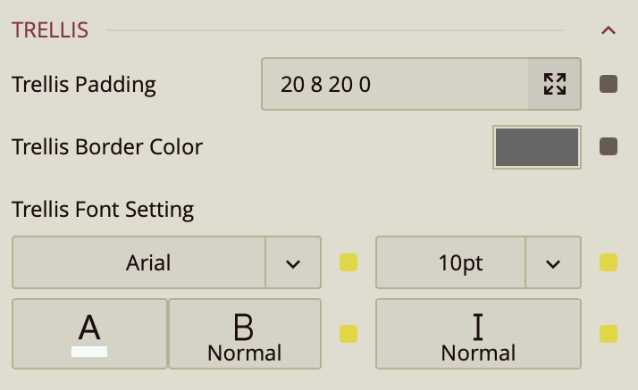 You can set the Padding around the Trellis Chart to control the spacing between the chart content and its edges. You can also define a Trellis Border Color to outline each panel of the trellis. Additionally, the Trellis Font Settings allow you to customize the font family, size, color, weight, and style of the text used in the trellis layout.