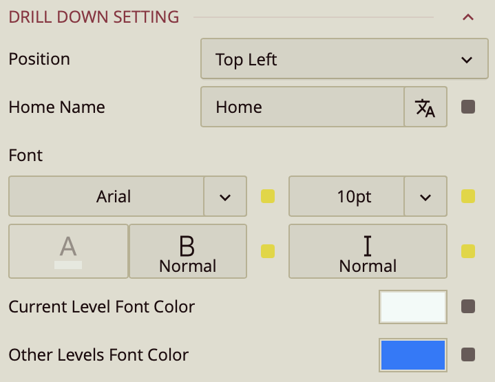 Other Levels Font Color – Sets the color for labels representing all non-active drill-down levels, allowing users to visually distinguish between the active and inactive levels in the navigation path.